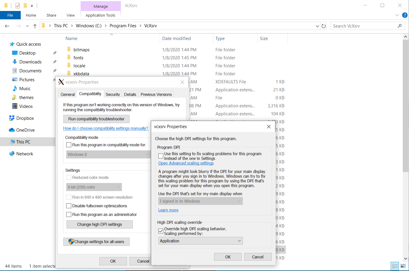 C:\Program Files\VcXsrv), right click onvcxsrv.exe. Choose Properties > Compatibility tab > Change high DPI settings > Enable Override high DPI scaling and change it toApplicationoption. Here is the screenshot looks like after changing the settings: