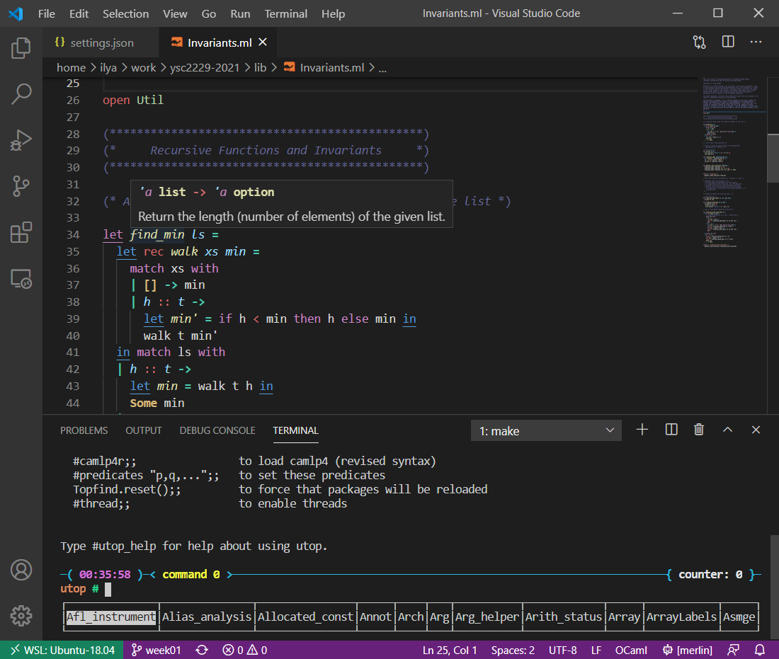 Ctrl-Shift-P, followed by “File: Open File”) and enjoy the advanced features: highlighting, code completion, and type information, as well as many others. An example of the UI is shown below. Notice the indicators at the bottom of the screen, showing that VSCode runs in WSL (Ubuntu), with OCaml support enabled: